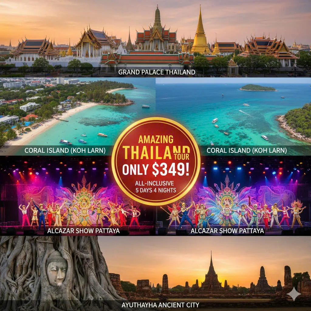 Experience the ultimate Thai adventure with our 5-Day Thailand Paradise tour. This comprehensive package combines the cultural richness of Bangkok with the beach paradise of Pattaya. Explore ancient temples, witness stunning historical sites at Ayutthaya, relax on pristine beaches, and enjoy world-class entertainment. This tour offers the perfect balance of culture, history, adventure, and relaxation.